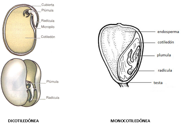 En ellos es donde se encuentra almacenada la reserva alimenticia y en algunas semillas puede tener una función fotosintética, con el fin de nutrir a nuestra planta los primeros días de vida. Estas estructuras sirven para separar las plantas con flor en dos grandes grupos las Monocotiledóneas: que presentan un solo cotiledón al germinar y las Dicotiledóneas que presentan dos cotiledones.