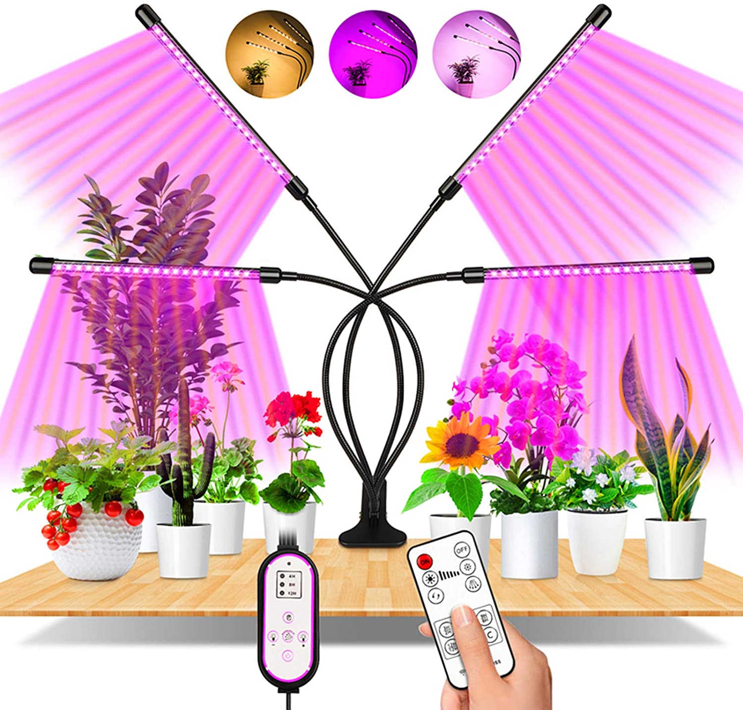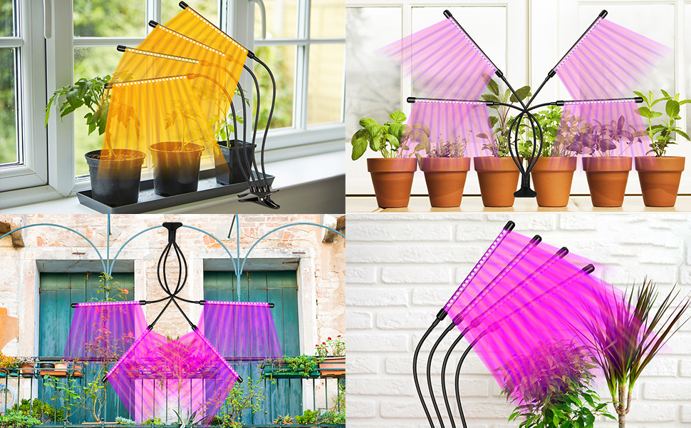 Sistema flexible y resistente. Cuenta con cuatro brazos flexibles de 360 grados que pueden ajustar fácilmente el ángulo y la distancia entre la luz y las plantas y pueden maximizar el área de iluminación y proporcionar energía para que las plantas crezcan. Al mismo tiempo, los robustos alicates antideslizantes son fáciles de colocar donde quiera, lo que le permite cultivar plantas caseras como desee.