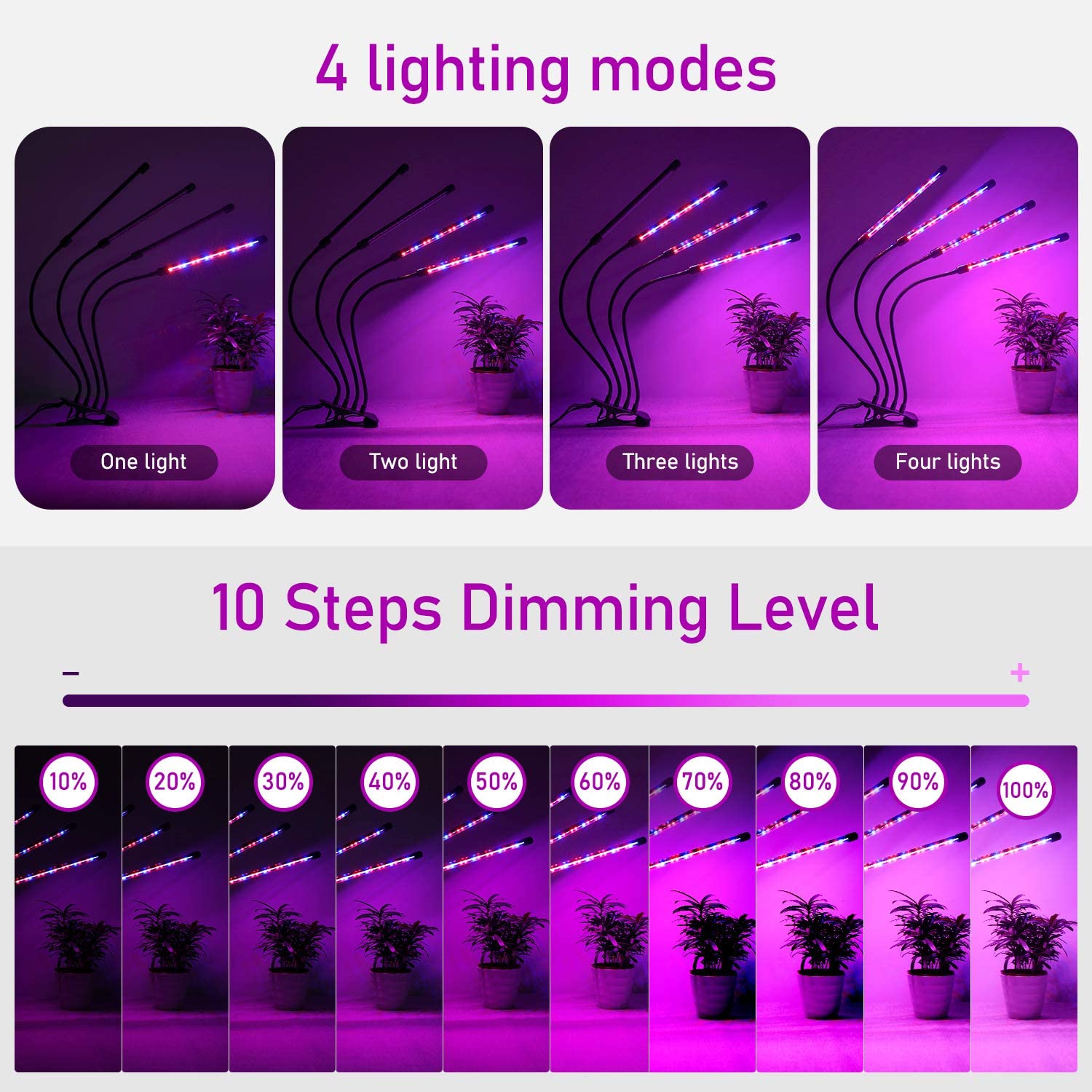 Cuenta con 3 modos de iluminación y modo de atenuación de 10 niveles. Tiene 3 modos de color (amarillo / azul, rojo / azul, rojo / amarillo) y 10 modos ajustables (10%, 20%, 30%. Y 100% de brillo). Por lo tanto, puede ajustar el brillo y el espectro de las luces de las plantas para ayudarlas a crecer de manera saludable. Las lámparas vegetales proporcionan energía a tus plantas durante todo el año y aumentan su rendimiento.