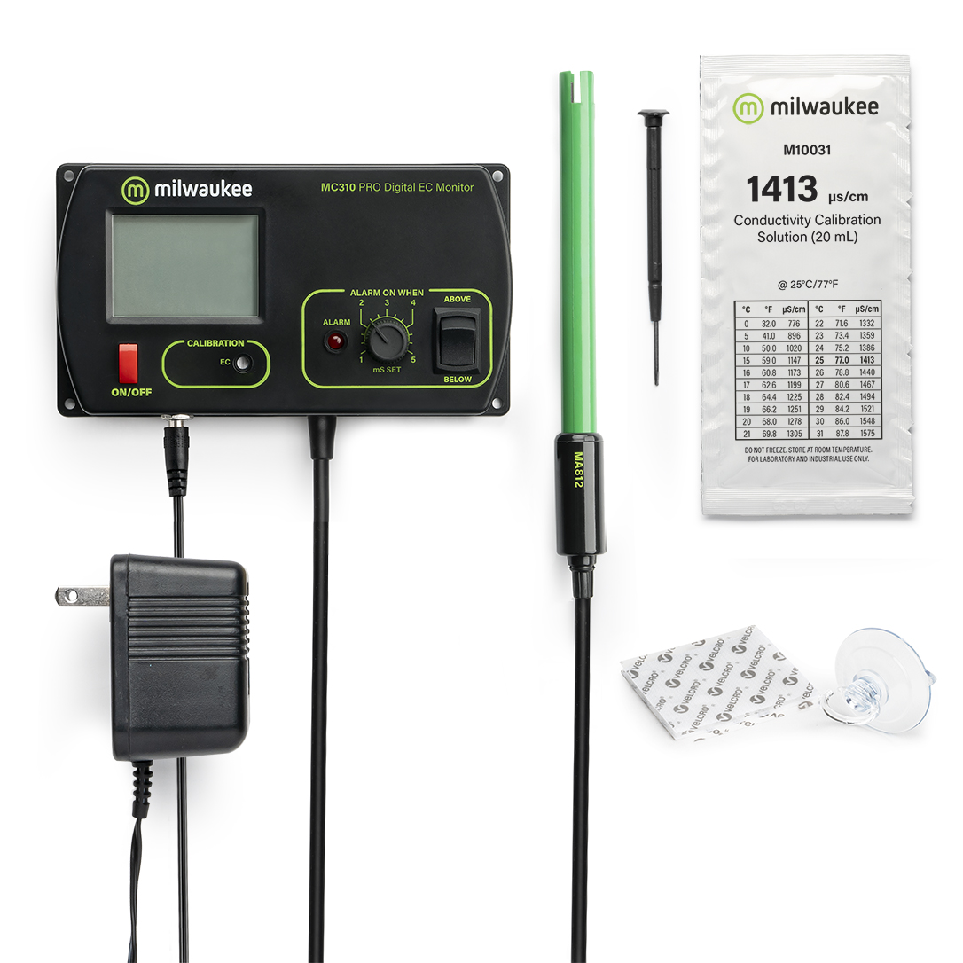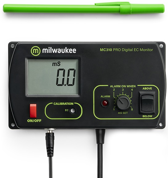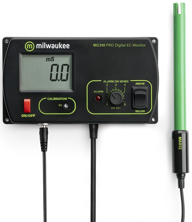 El medidor de EC continuo MC310 es un medidor de EC continuo con un dispositivo de alarma visual (Led Rojo) con escala de 0.0 hasta 10.0 mS/cm que esta alimentado con un adaptador 12VDC (incluido).