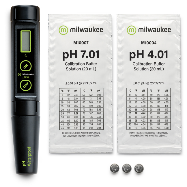 PH51 es un medidor de pH a prueba de agua con calibración manual de 2 puntos, precisión de pH de ± 0.1 y un rango de pH de 0.0 a 14.0.