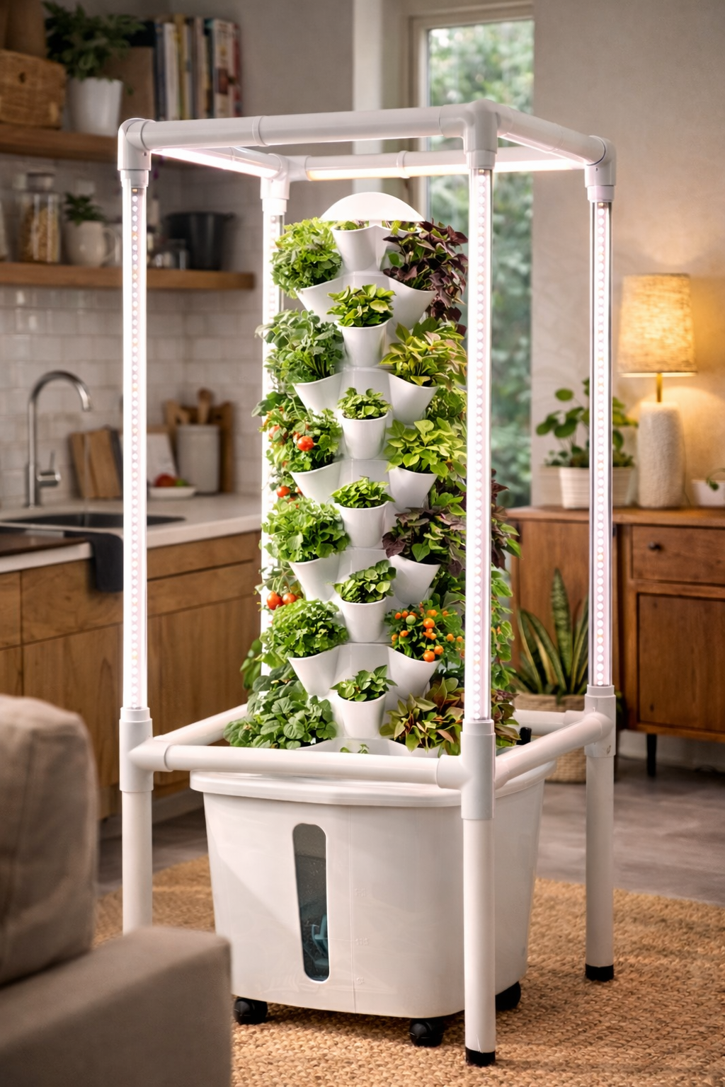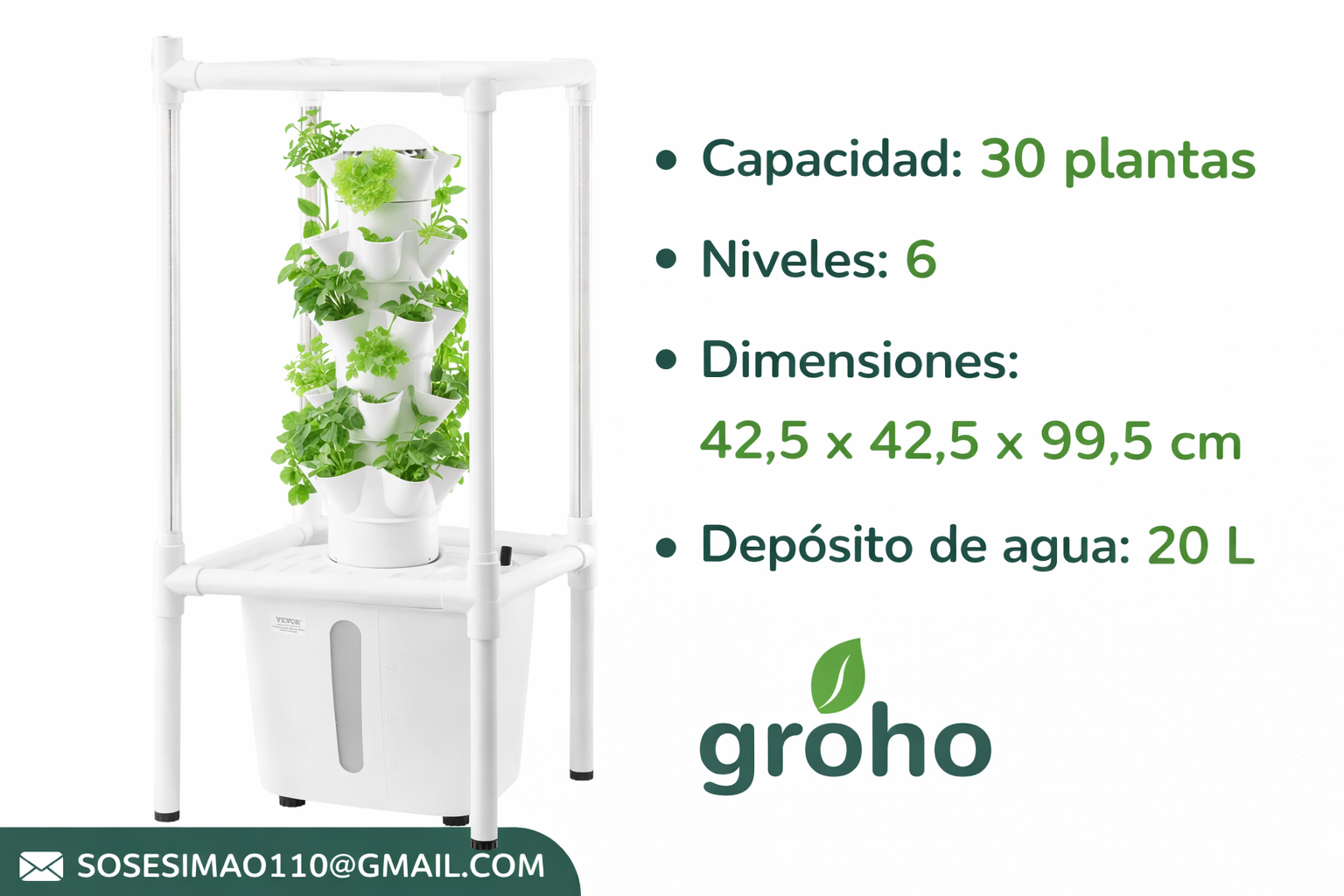 Cultiva hasta 30 plantas durante todo el año con esta torre de hidroponía vertical con iluminación LED integrada, ideal para producir alimentos frescos en casa incluso con poca luz natural. Compacta, eficiente y fácil de usar, es perfecta para cocinas, balcones y apartamentos.
